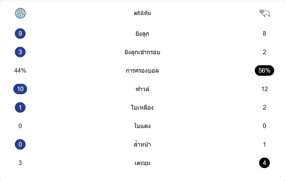 ตัวเลขหลังเกมบอกชัดว่าเกมนี้สูสี เลสเตอร์มีโอกาสยิงทั้งหมด 9 ครั้ง เข้ากรอบ 3 ครั้ง ขณะที่ดาร์บี้ยิง 8 ครั้ง เข้ากรอบ 2 ครั้ง ฝั่งทีมเยือนครองบอลมากกว่า 56% ต่อ 44% ของเจ้าถิ่น แต่เลสเตอร์ใช้โอกาสได้คมกว่า เปลี่ยนสองจากสามครั้งที่เข้ากรอบให้เป็นสกอร์จริง ๆ เกมเต็มไปด้วยการปะทะกลางสนาม ฟาวล์รวมกัน 22 ครั้ง (เลสเตอร์ 10, ดาร์บี้ 12) ใบเหลืองเจ้าบ้าน 1 ใบ ทีมเยือน 2 ใบ ไม่มีใบแดง ล้ำหน้าฝั่งดาร์บี้ 1 ครั้ง ขณะที่ลูกเตะมุมเป็นทีมเยือนที่ได้มากกว่าเล็กน้อย 4 ต่อ 3 สะท้อนว่าดาร์บี้บุกใส่อยู่เรื่อย แต่เลสเตอร์เล่นตรงเป้าและปิดจังหวะสำคัญได้ดีกว่า