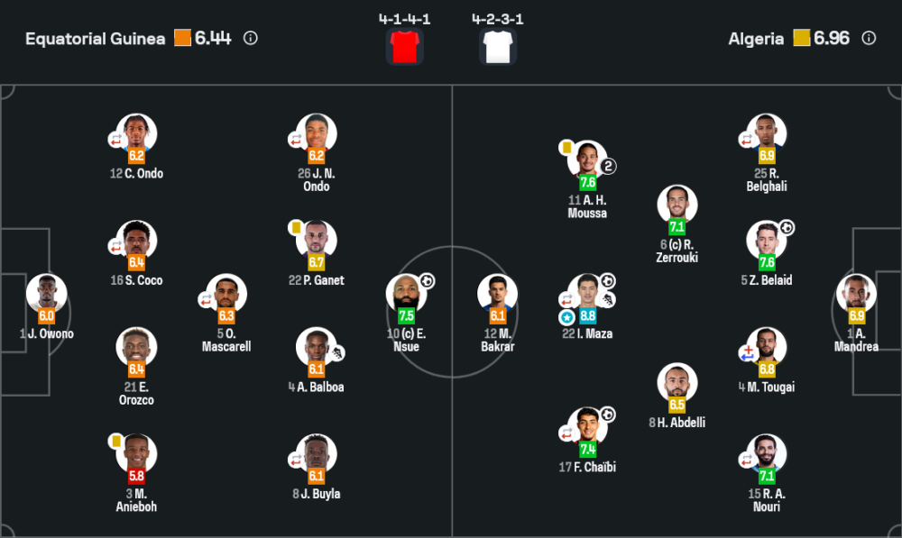 นักเตะที่โดดเด่นชัดเจนจากเรตติ้งสูงสุดคือ Emilio Nsue (7.5) ฝั่งเจ้าบ้าน ส่วนทีมเยือนนำโดย Ibrahim Maza (8.8), Zineddine Belaid (7.6) และ Anis Hadj Moussa (7.6)