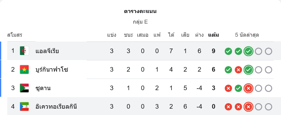 📈 สถานการณ์ในตารางคะแนนแอฟริกันเนชันส์ คัพ กลุ่ม E