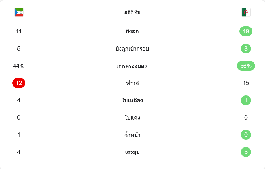 จำนวนฟาวล์ก็สะท้อนความตึงเครียดของเกม เจ้าบ้านทำฟาวล์ 12 ครั้งได้ใบเหลือง 4 ใบ ขณะที่แอลจีเรียฟาวล์ 15 ครั้งโดนใบเหลืองเพียง 1 ใบ แสดงให้เห็นว่าทีมเยือนอ่านเกมได้ดีและรู้จังหวะตัดฟาวล์โดยไม่เสี่ยงเกินไป นอกจากนี้ ลูกเตะมุมเป็นของอัลจีเรีย 5 ครั้งต่อ 4 ครั้งของอิเควทอเรียลกินี บ่งบอกว่าทีมเยือนบุกกดดันในพื้นที่สุดท้ายได้มากกว่าอย่างชัดเจน