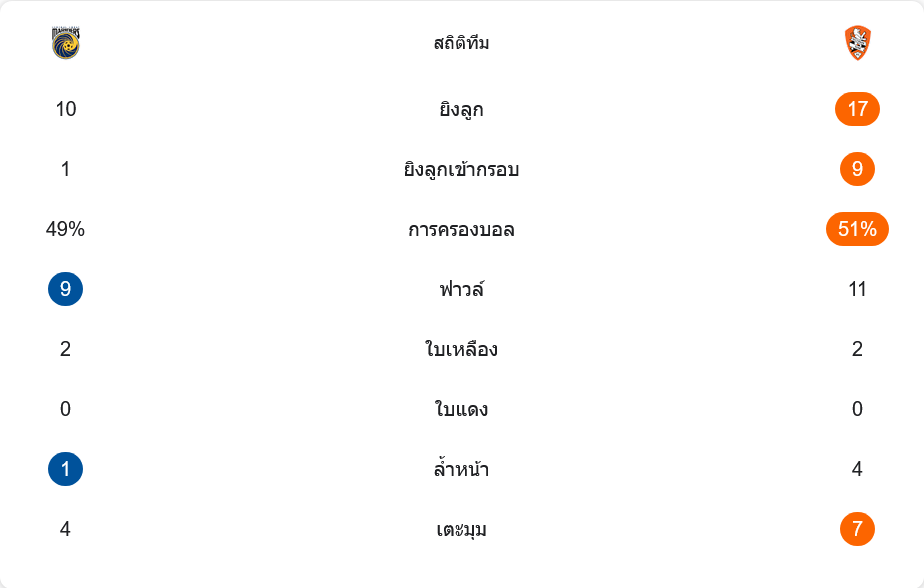 จำนวนฟาวล์เกือบเท่ากัน แสดงให้เห็นว่าเป็นเกมที่เล่นกันดุดันทั้งคู่ ใบเหลืองทีมละสองใบ ไม่มีใบแดง แต่ก็มีจังหวะปะทะหนักหลายครั้งโดยเฉพาะช่วงท้ายที่ความกดดันสูงมาก ลูกเตะมุม บริสเบน โรว์ ได้ถึง 7 ครั้ง มากกว่าเจ้าบ้านที่ได้ 4 ครั้ง ยิ่งตอกย้ำว่าเกมรุกด้านข้างของทีมเยือนทำงานได้ดีแค่ไหนในค่ำคืนนี้