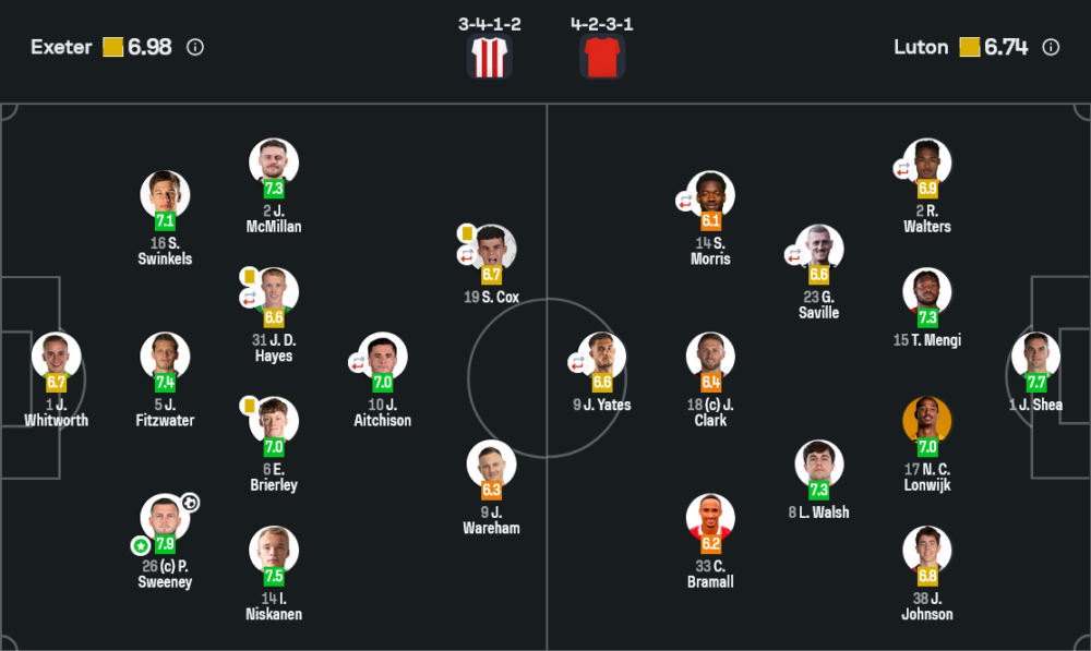 ช่วงท้ายเกม เอ็ดวิน บรายร์ลีย์ โดนใบเหลืองเพิ่มจากการถ่วงเวลา นาที 78 ก่อนที่ ลูก้า วูดเฮาส์ จะถูกส่งลงมาแทน จอช เอจิสัน นาที 88 เพื่อปิดเกมรับ ช่วงทดเวลาบาดเจ็บ ลูตันพยายามยัดบอลเข้าเขตโทษทุกวิธีแต่ยังไม่ผ่านกำแพงของสวีนนีย์ ทำให้จบ 90 นาที เอ็กซ์เซเตอร์ เฉือนชนะ 1-0 เก็บสามแต้มโคตรสำคัญต่อหน้าแฟนตัวเอง