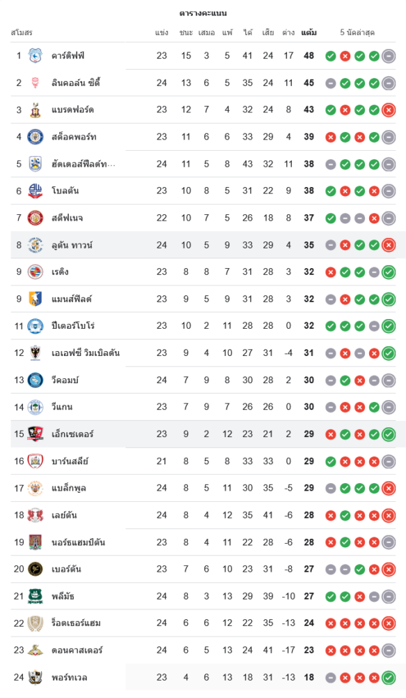 ส่วนลูทัน ทาวน์ แพ้เกมนี้ยังคงมี 35 คะแนน อยู่อันดับ 8 ตามหลังพื้นที่เพลย์ออฟเลื่อนชั้นที่อันดับ 6 อย่างโบลตันและฮัดเดอร์สฟิลด์อยู่ 3 แต้ม เหมือนเครื่องกำลังจะติดแต่โดนสะดุดเอาดื้อๆ เกมนี้จึงอาจกลายเป็นจุดที่พวกเขาต้องกลับไปทบทวนว่าเกมรุกในพื้นที่สุดท้ายยังขาดอะไร หากแก้จุดนี้ไม่ได้ โอกาสลุ้นไต่ขึ้นไปเล่นเพลย์ออฟอาจหลุดมือเอาง่ายๆ