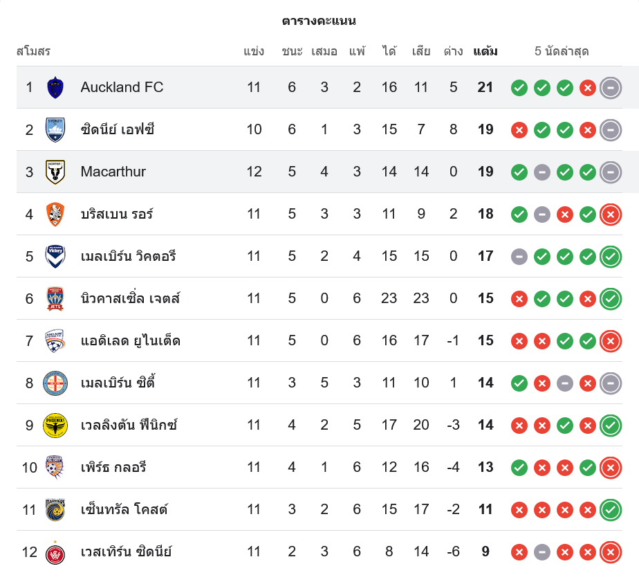 หลังจบเกมเสมอ 1-1 โอ๊คแลนด์ เอฟซี เก็บเพิ่ม 1 แต้ม รวมเป็น 21 คะแนนจาก 11 นัด ยังยึดตำแหน่งจ่าฝูงเอ-ลีก เมน เอาไว้ได้อย่างเหนียวแน่น แม้จะพลาดโอกาสหนีห่างคู่แข่ง แต่ภาพรวมยังถือว่าอยู่ในเส้นทางลุ้นแชมป์เต็มตัว
