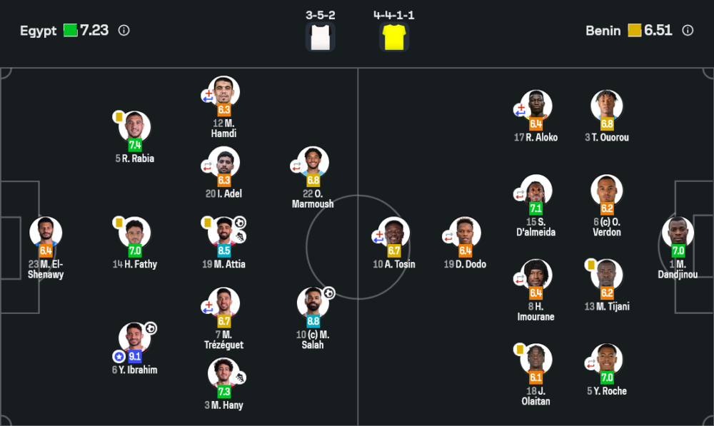 ยัสเซอร์ อิบราฮิม คือหัวใจของอียิปต์ในเกมนี้อย่างแท้จริง บ้านกีฬาให้ผ่านฉลุยทั้งเกมรับและเกมรุก ได้คะแนนสูงสุด 9.1 ไม่ใช่เรื่องบังเอิญ เขายืนคุมแดนกลางได้แน่น อ่านจังหวะเคลื่อนที่ของแนวรุกเบนินได้ดี เก็บลูกกลางอากาศแทบทั้งหมด