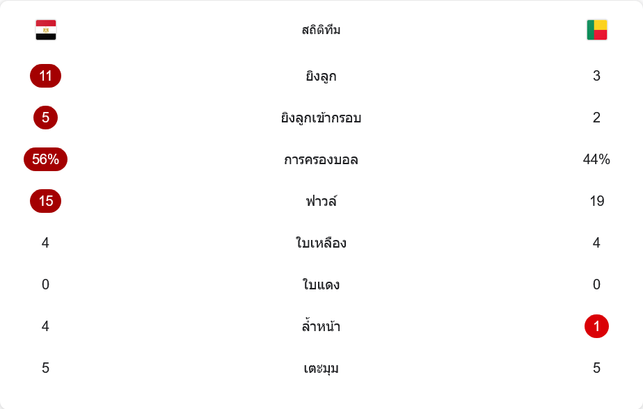 ตัวเลขหลังเกมยืนยันสิ่งที่แฟนบอลเห็น อียิปต์ยิงทั้งหมด 11 ครั้ง เข้ากรอบ 5 ครั้ง ขณะที่เบนินมีโอกาสยิงเพียง 3 ครั้ง เข้ากรอบ 2 ครั้งเท่านั้น การครองบอลฟาโรห์เหนือกว่าชัด 56 เปอร์เซ็นต์ ต่อ 44 เปอร์เซ็นต์ แสดงให้เห็นว่าคุมจังหวะเกมได้เกือบตลอด 120 นาที
