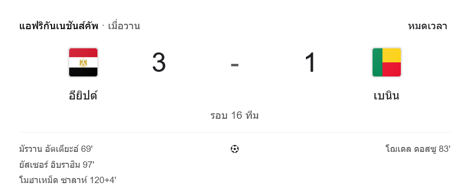 อย่างไรก็ตามในช่วงต่อเวลา ประสบการณ์และคุณภาพนักเตะของอียิปต์คือจุดชี้ขาด ลูกตั้งเตะและลูกกลางอากาศที่วางเป้าให้ ยัสเซอร์ อิบราฮิม ถือเป็นหมัดเด็ดที่ทีมใช้อย่างคุ้มค่า ขณะที่เบนินเมื่อเปิดหน้าแลกเต็มตัว เกมรับเริ่มหลวมจนถูกซาลาห์ลงโทษในนาทีสุดท้าย หากมองภาพรวมในแง่การ วิเคราะห์บอล เกมนี้จึงเป็นตัวอย่างชัดเจนของทีมใหญ่ที่ใช้ความนิ่งและทีเด็ดรายบุคคลปิดเกมเหนือแท็กติกรับแน่นของทีมรองบ่อน