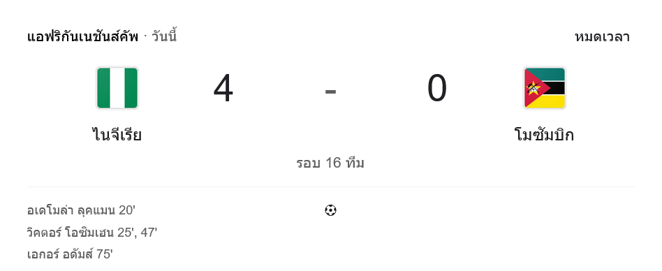 ศึก แอฟริกาคัพออฟเนชันส์ รอบ 16 ทีม คืนเดือดที่ไนจีเรียลงสนามชนโมซัมบิก กลายเป็นเกมที่แฟนบอลสายเช็ก ผลบอลสด แทบไม่ต้องลุ้นยาว เพราะ “อินทรีมรกต” เปิดโหมดบุกแหลกตั้งแต่นาทีแรก กดดันคู่แข่งจนหายใจไม่ทั่วท้อง และปิดจ๊อบด้วยสกอร์ขาด 4-0 อย่างเหนือชั้น บ้านกีฬาขอพาเก็บทุกช็อตแบบจัดเต็ม