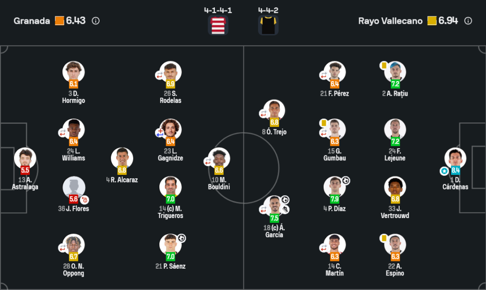 เกมนี้เป็นการดวลแท็กติกระหว่างระบบ 4-1-4-1 ของกรานาดา กับ 4-4-2 ของราโย่ โดยเจ้าบ้านเลือกให้ตริเกรอสยืนเป็นหัวใจแดนกลาง มีอัลการาซเป็นตัวตัดเกมหน้ากองหลัง แล้วปล่อยให้แซนซ์กับโรเดลาสลากเลื้อยริมเส้นคอยสนับสนุนบูดลินีหอกเดี่ยว