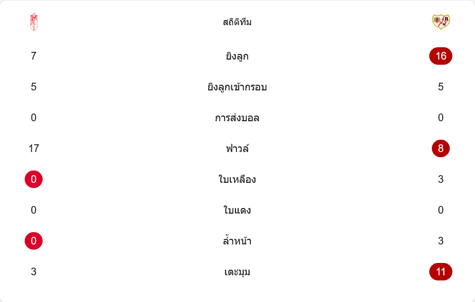 ตัวเลขหลังเกมสะท้อนชัดว่าราโย่บาเยกาโน่สมควรเป็นผู้ชนะ ทีมเยือนสร้างโอกาสยิงได้ถึง 16 ครั้ง เข้ากรอบ 5 ครั้ง เท่ากับกรานาดาที่มีเพียง 7 ครั้งตลอดเกม แปลว่าราโย่บุกต่อเนื่องและกดดันแนวรับเจ้าบ้านอย่างไม่หยุดพัก แม้จำนวนฟาวล์ของกรานาดาจะมากกว่าอย่างชัดเจนที่ 17 ครั้งต่อ 8 ครั้งของราโย่ แสดงให้เห็นว่าทีมเจ้าถิ่นต้องพึ่งการตัดฟาวล์เพื่อหยุดเกมบุกหลายจังหวะ ขณะที่ใบเหลืองทั้งหมด 3 ใบตกเป็นของฝั่งทีมเยือน แต่ก็ยังคุมเกมได้ดี ไม่มีใครโดนไล่ออก