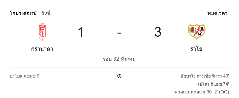 - ⚽ นาที 90+2: ฆาเมส ฟลอเรส สกัดบอลพลาดเข้าประตูตัวเอง สกอร์ขยับเป็น 3-1 ให้ราโย่