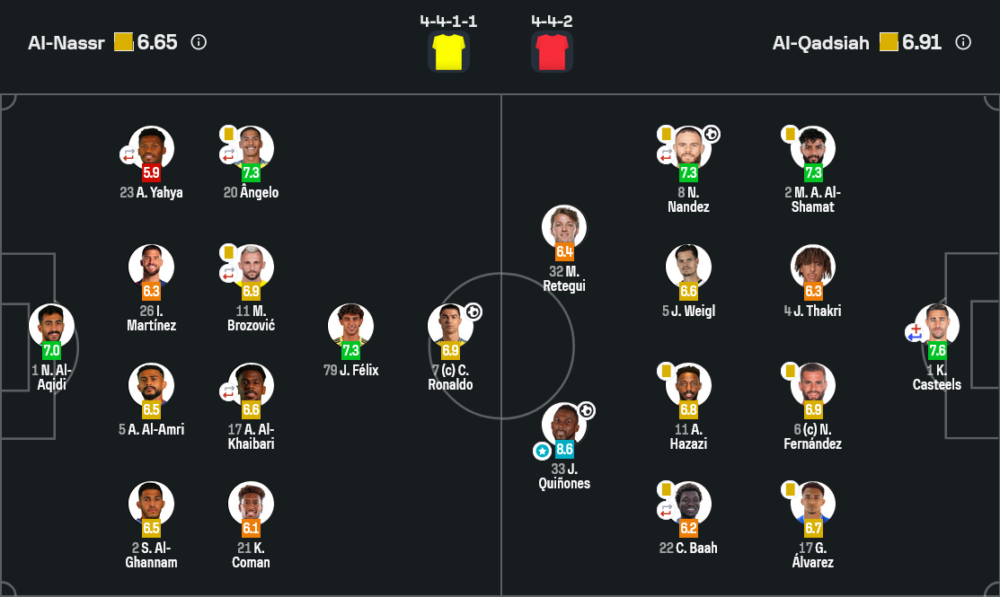 ด้าน อัล คัดซิยาห์ ของ Brendan Rodgers เลือกใช้ระบบ 4-4-2 แบบยืดหยุ่น เกมรุกวางคู่หน้า Retegui–Quiñones เน้นวิ่งทำทางและเก็บบอลจังหวะแรก ขณะที่ปีกอย่าง Baah กับ Nández มีหน้าที่สวนกลับเร็ว เมื่อทีมได้บอลจะไม่ต่อเนื่องยืดยาว แต่ใช้ไม่กี่จังหวะทะลุแนวรับเจ้าบ้านทันที ซึ่งเห็นได้ชัดจากจำนวนยิงเข้ากรอบ 8 ครั้งจากโอกาสเพียง 10 หน แสดงถึงความเฉียบคมและเลือกจบสกอร์ในพื้นที่ที่มีโอกาสสูง