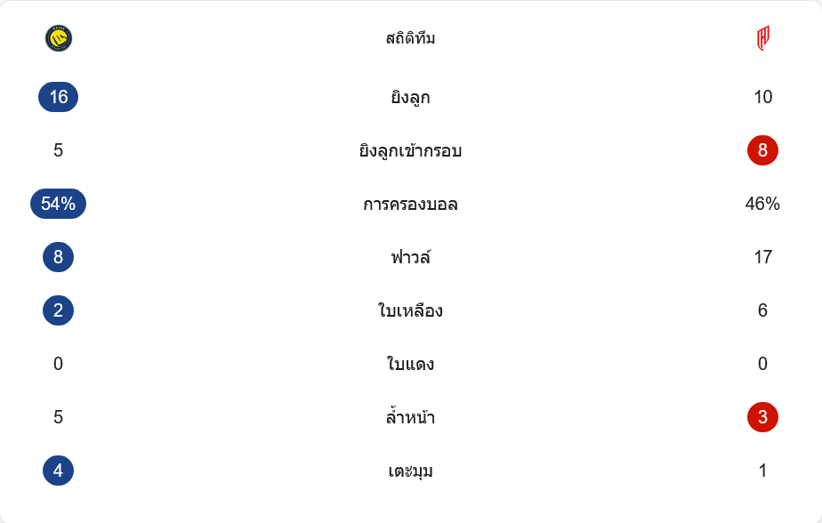 ตัวเลขหลังเกมสะท้อนภาพได้ชัดว่า อัล นาสเซอร์เป็นฝ่ายคุมเกม ยิงรวมถึง 16 ครั้ง มากกว่า อัล คัดซิยาห์ ที่มี 10 ครั้ง แต่สิ่งสำคัญคือจำนวนยิงเข้ากรอบ เจ้าบ้านทำได้เพียง 5 ครั้ง ขณะที่ทีมเยือนกดเข้ากรอบถึง 8 ครั้งจากโอกาสไม่มาก นั่นคือความแตกต่างในเรื่องคุณภาพการจบสกอร์