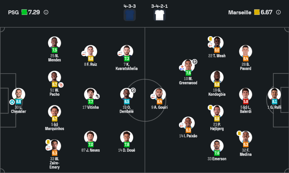 - Vitinha (7.7) – หนึ่งแอสซิสต์ให้เดมเบเล่ ยิงจุดโทษเข้าอย่างเฉียบขาด