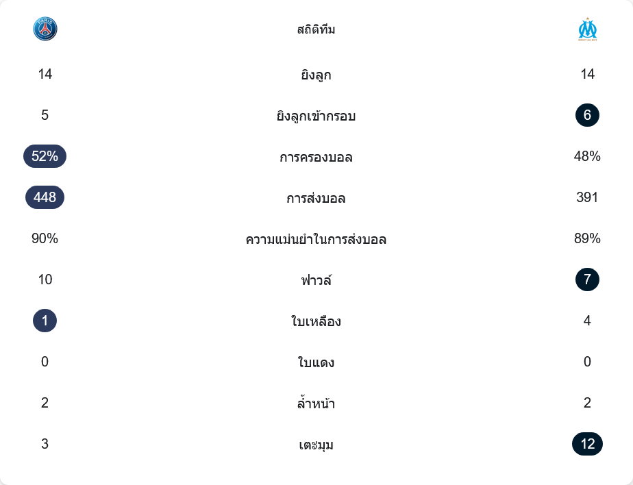 ในแง่เกมปะทะ เปแอสเชทำฟาวล์ 10 ครั้งน้อยกว่ามาร์กเซยที่ 7 ครั้ง แต่ทีมเยือนกลับโดนใบเหลืองถึง 4 ใบ มากกว่าปารีสที่มีเพียง 1 ใบ ซึ่งสะท้อนให้เห็นว่าจังหวะปะทะของมาร์กเซยหลายครั้งจัดหนักเกินเหตุ ส่วนลูกเตะมุม มาร์กเซยได้ถึง 12 ครั้ง ขณะที่เปแอสเชมีเพียง 3 ครั้งเท่านั้น นี่คือเหตุผลว่าทำไมแนวรับเจ้าถิ่นถึงต้องทำงานหนักกับลูกกลางอากาศตลอดทั้งเกม