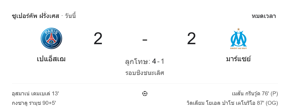 ศึกโทรเฟ่ เดส์ ช็องปิยงส์ เกมชิงถ้วยซูเปอร์คัพเมืองน้ำหอม เปิดหัวซีซั่นด้วยดราม่าจนแฟนบอลต้องเช็กสกอร์จาก ผลบอลสด กันแทบทุกนาที เมื่อปารีส แซงต์-แชร์กแมง ดวลเดือดโคตรอริ โอลิมปิก มาร์กเซย แบบใส่กันไม่มียั้ง จบ 90 นาทีเสมอ 2-2 ก่อนที่เปแอสเชจะแม่นกว่าในการดวลจุดโทษ ยิงเข้า 4-1 ผงาดคว้าโทรฟี่ใบแรกของฤดูกาลได้สำเร็จ