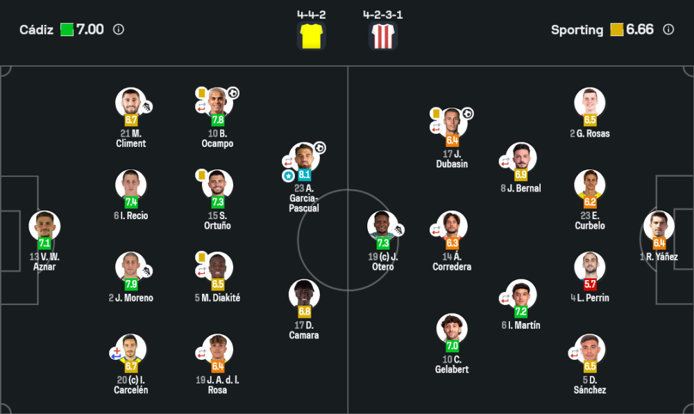 - 🟨 81′ – ใบเหลือง เซร์คิโอ ออร์ตูโญ (กาดิซ) จากการฟาวล์ตัดเกมในแดนกลาง