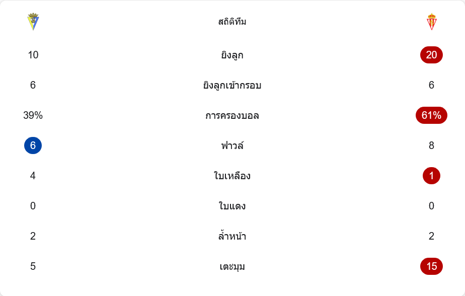 ตัวเลขบอกเรื่องราวชัดเจน สปอร์ติ้ง กิฆอน ครองบอลถึง 61% เหนือกว่ากาดิซที่มีเพียง 39% และสร้างโอกาสยิงได้ถึง 20 ครั้ง เทียบกับเจ้าถิ่น 10 ครั้ง แต่ที่น่าสนใจคือจำนวนลูกยิงเข้ากรอบกลับเท่ากันที่ 6 ครั้ง แปลว่ากาดิซใช้ทุกจังหวะสำคัญได้มีประสิทธิภาพมากกว่า แม้จะต้องตั้งรับนานแต่ไม่ได้ถูกกดจนหมดรูป