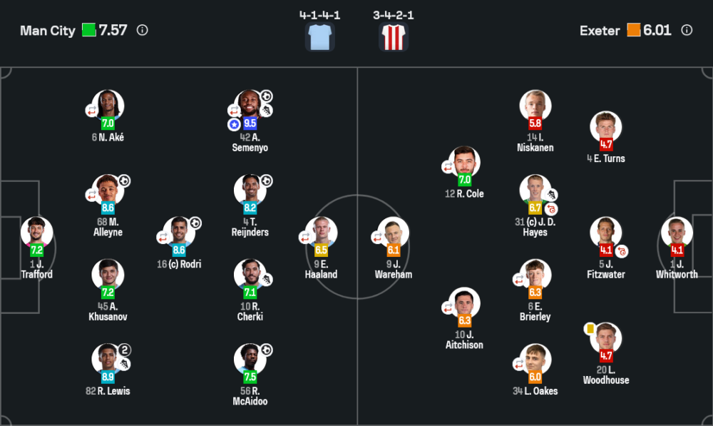- 🔁 46′ ซิตี้เปลี่ยนสามคน ส่ง นิโก โอเรลลี, ดีไวน์ มูคาซา, สตีเฟน มฟูนี ลงแทน โรดรี, อาเก, ฮาแลนด์ ขณะที่เอ็กเซเตอร์ส่ง จอช มาเกนนิส ลงแทน แวร์แฮม