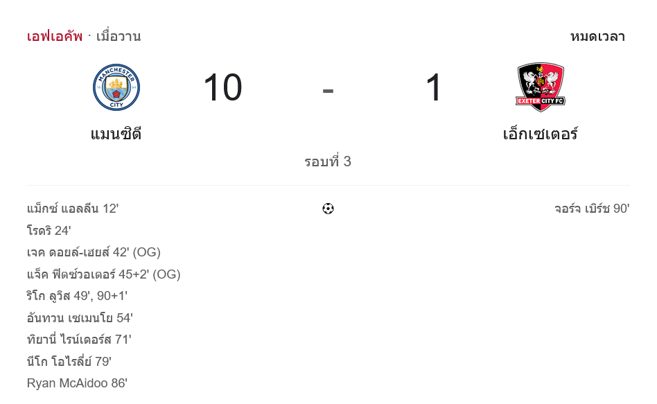 จาก : ผลบอลสด เอฟเอ คัพ ระหว่าง แมนเชสเตอร์ ซิตี้ 10-1 เอ็กเซเตอร์ ซิตี้ วันนี้ 10/1/69 – บ้านกีฬา