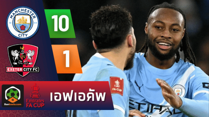 บ้านกีฬาเก็บสัญญาณจากจอแบบเรียลไทม์ พร้อมเช็ก ผลบอลสด คู่เดือดที่เอติฮัด สเตเดียม เกมเอฟเอ คัพ รอบ 3 ที่แมนเชสเตอร์ ซิตี้ ของเปปิน ลินเดอร์ส เปิดบ้านรับการมาเยือนของเอ็กเซเตอร์ ซิตี้ ทีมจากลีกวัน กลายเป็นค่ำคืนที่แฟน “เรือใบสีฟ้า” ได้เฮกันจนคอแห้ง เมื่อทีมรักเดินหน้าถล่มคู่แข่งยับ 10-1 ใส่สกอร์ระดับเทสต์เกมอุ่นเครื่อง แต่ทำกันในทัวร์นาเมนต์จริงแบบไม่ไว้หน้า