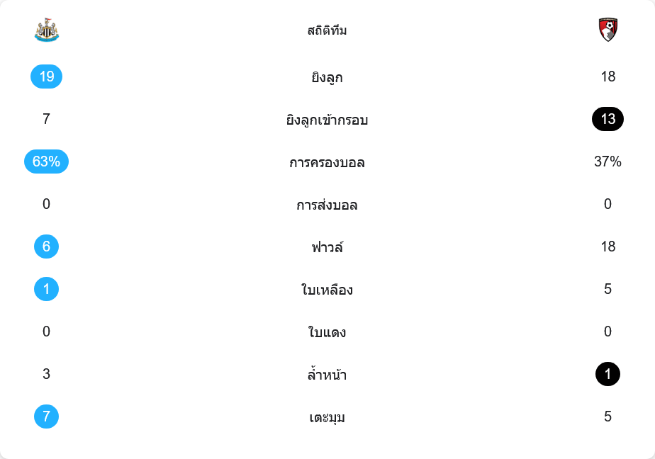 ตัวเลขหลังเกมสะท้อนภาพได้ชัดเจน นิวคาสเซิลสร้างโอกาสยิงทั้งหมด 19 ครั้ง เข้ากรอบ 7 ครั้ง ขณะที่บอร์นมัธแม้ครองบอลเพียง 37% แต่ได้ยิงถึง 18 ครั้ง เข้ากรอบมากถึง 13 ครั้ง เรียกได้ว่าทุกครั้งที่สวนกลับขึ้นมามักจบด้วยการบังคับให้ แรมส์เดล ต้องเซฟอยู่ตลอด