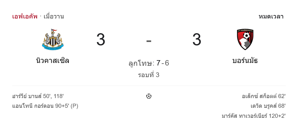 ศึกเอฟเอ คัพ รอบ 3 ที่เซนต์เจมส์ พาร์ก กลายเป็นค่ำคืนดราม่าเต็มรูปแบบ เมื่อ นิวคาสเซิล ยูไนเต็ด เปิดบ้านเสมอ บอร์นมัธ 3-3 ก่อนดวลจุดโทษชนะ 7-6 ผ่านเข้ารอบแบบหืดจับ แฟนบอลที่ตามเช็ก ผลบอลสด กันแทบไม่ทันกับจังหวะพลิกไปพลิกมา โดยเจ้าถิ่นได้สองประตูจาก ฮาร์วีย์ บาร์นส์ และอีกหนึ่งลูกจากจุดโทษของ แอนโธนี กอร์ดอน ขณะที่ทีมเยือนยิงสวนจาก อเล็กซ์ สก็อตต์, เดวิด บรูคส์ และ มาร์คัส ทาเวอร์เนียร์