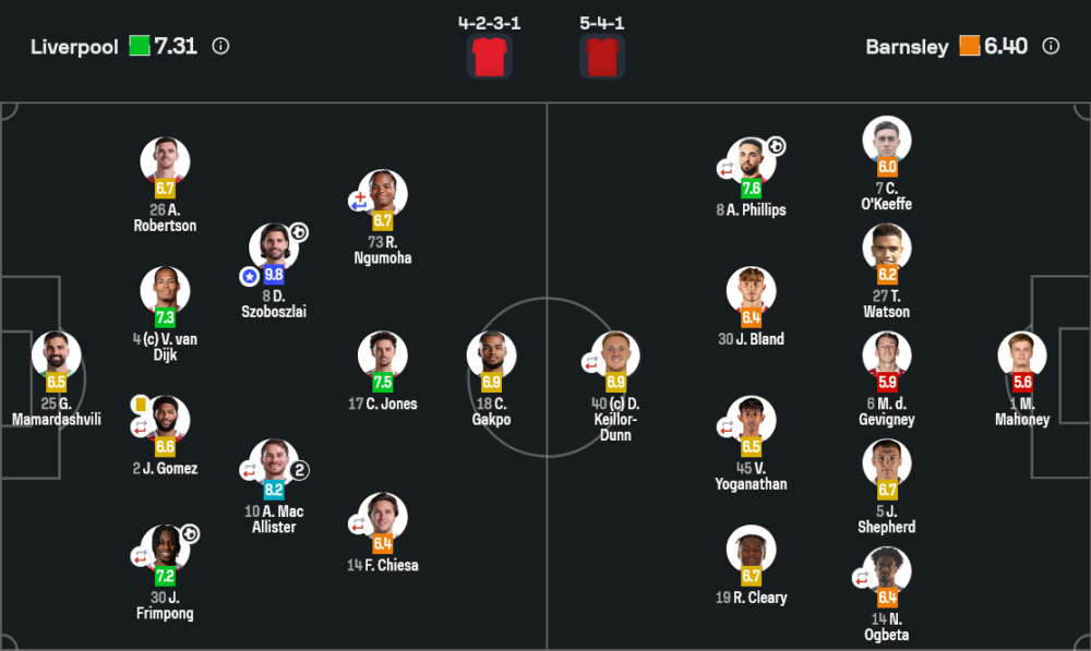 คนที่โดดเด่นที่สุดคงไม่มีใครเถียง โดมินิค โซบอสซ์ไล เพลย์เมกเกอร์ชาวฮังกาเรียนคว้าคะแนนสูงสุด 9.8 ไม่ใช่แค่เพราะประตูสุดสวยตั้งแต่ต้นเกม แต่ยังเพราะการคุมจังหวะบุกแทบทุกครั้ง ลูกสลับแกนเปลี่ยนข้าง เล่นลูกสั้น-ลูกยาวแม่นยำ วางบอลให้เพื่อนหลุดขึ้นไปเล่นงานแนวรับบาร์นสลีย์อยู่ตลอด บ้านกีฬา มองว่าเกมนี้โซบอสซ์ไลโชว์ให้เห็นครบทั้งพลัง วิสัยทัศน์ และความมั่นใจแบบผู้นำเกมรุกตัวจริง