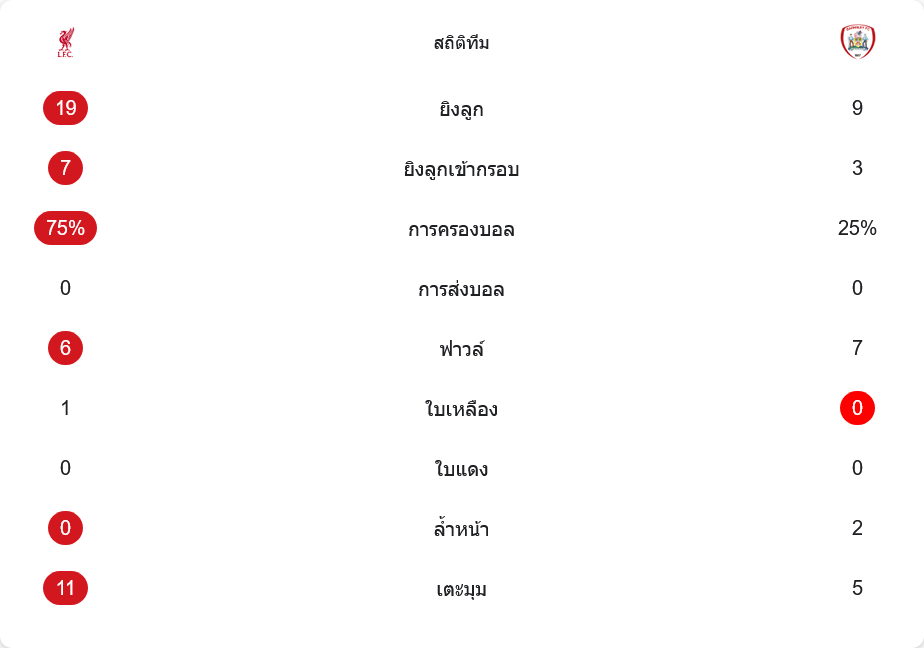 ตัวเลขหลังเกมสะท้อนทุกอย่าง ลิเวอร์พูลยิงรวม 19 ครั้ง เข้ากรอบ 7 ครั้ง ขณะที่บาร์นสลีย์ได้ลุ้น 9 ครั้ง เข้ากรอบ 3 ครั้งเท่านั้น การครองบอลเจ้าถิ่นกดถึง 75% เหลือให้ทีมเยือนแค่ 25% ซึ่งชัดเจนว่าตลอดทั้งเกมหงส์แดงเป็นฝ่ายตั้งหลักบุกอยู่ฝั่งเดียว เตะมุมลิเวอร์พูลได้ถึง 11 ครั้ง ส่วนบาร์นสลีย์เพียง 5 ครั้ง แสดงให้เห็นถึงการปักหลักบุกในแดนคู่แข่งอย่างต่อเนื่อง