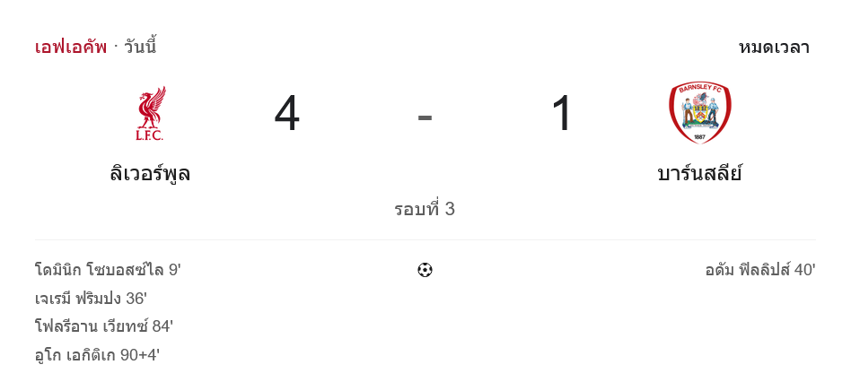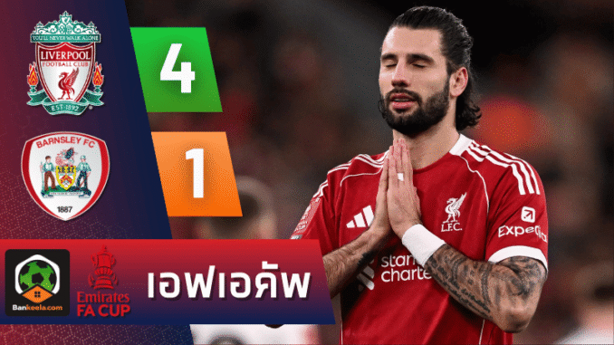 ศึกเอฟเอ คัพ อังกฤษ รอบ 3 ที่แอนฟิลด์ ลิเวอร์พูลเปิดบ้านรับการมาเยือนของบาร์นสลีย์ ทีมจากลีกวัน เกมนี้ “หงส์แดง” จัดชุดผสมแต่แนวรุกยังโหดครบเครื่อง ก่อนจะอัดทีมเยือนขาดลอย 4-1 จากประตูของ โดมินิค โซบอสซ์ไล, เจเรมี ฟริมปง, ฟลอเรียน เวียร์ตซ์ และ อูโก เอกิติเก้ ขณะที่อดัม ฟิลลิปส์ ยิงตีไข่แตกให้บาร์นสลีย์ จบเกมด้วยสกอร์ที่แฟนเช็ก ผลบอลสด กันสะใจทั้งแอนฟิลด์
