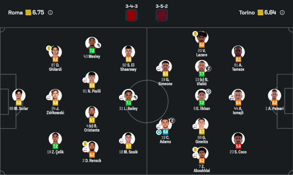 ส่วนโตริโน่ วาง 3-5-2 เน้นเกมโต้กลับและจังหวะเปลี่ยนจากรับเป็นรุกเร็ว ใช้ วลาซิช เป็นเพลย์เมกเกอร์คอยเชื่อมบอลกับคู่หน้า แล้วปล่อยให้ อดัมส์ ใช้สปีดและการสับไกนอกกรอบเป็นอาวุธหลัก ประตูแรกและประตูที่สองเป็นตัวอย่างชัดเจน ทั้งสองจังหวะทีมเยือนต่อบอลไม่กี่ครั้งก็หลุดไปยิงแบบเน้น ๆ ยิ่งท้ายเกมเมื่อโรม่าดันไลน์สูงล่าประตูแซง เตะมุมครั้งเดียวของโตริโน่กลับทำให้แนวรับเจ้าบ้านหลุดตำแหน่ง ปล่อยให้ อิลคาน ยิงโล่ง ๆ กลายเป็นประตูหักอกทั้งสนาม