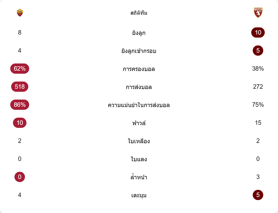 ตัวเลขหลังเกมยืนยันสิ่งที่สายตาเห็น โรม่าเป็นฝ่ายครองบอลถึง 62% ต่อ 38% ส่งบอลสำเร็จ 518 ครั้ง เทียบกับ 272 ครั้งของทีมเยือน ความแม่นยำการจ่ายบอลของเจ้าบ้านสูงถึง 86% ส่วนโตริโน่อยู่ที่ 75% โอกาสยิงทั้งหมด โรม่าได้ 8 ครั้ง เข้ากรอบ 4 ส่วนโตริโน่ยิง 10 ครั้ง เข้ากรอบ 5 ครั้ง ซึ่งแปลว่าทุกครั้งที่ทีมเยือนลุกขึ้นมาบุกมีลุ้นประตูมากกว่าอย่างชัดเจน