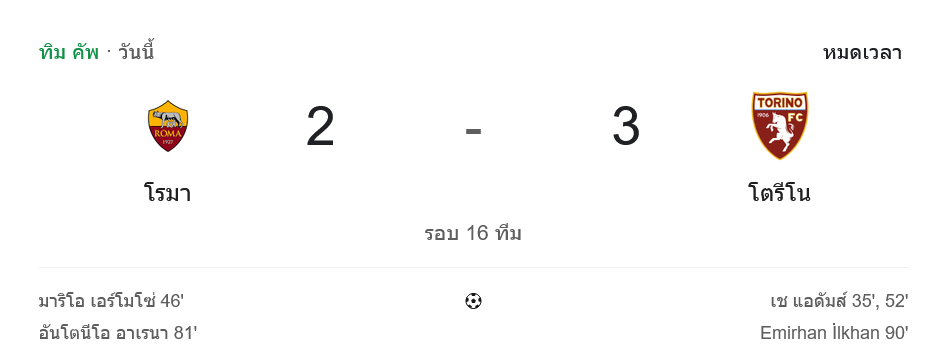 - 🔚 นาที 96 ผู้ตัดสินเป่าจบเกม โรม่า พ่าย โตริโน่ 2-3 ร่วงตกรอบ 16 ทีมสุดท้าย