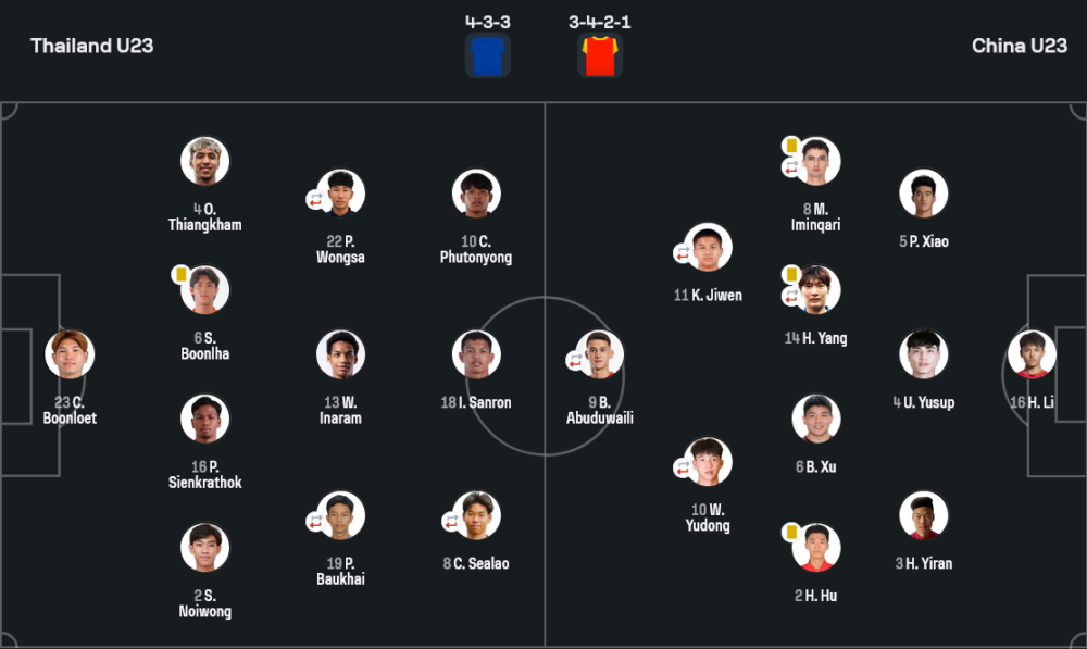 ด้าน จีน ยู-23 ใช้ระบบ 3-4-2-1 เน้นเกมรับเป็นหลัก วางแนวหลังสามคนปิดพื้นที่หน้ากรอบเขตโทษแล้วปล่อยให้วิงแบ็กสองข้างขึ้นลงตามจังหวะ จุดแข็งคือการยืนโซนเสียบสกัดเร็ว ทำให้ไทยเจาะช่องตรงกลางไม่ได้ ต้องออกบอลไปริมเส้นตลอด ส่วนเกมรุกเน้นเปิดบอลยาวจากหลังสู่หน้า หวังให้หน้าเป้าพักบอลแล้วไหลให้ตัวรุกสองคนตามไปยิง