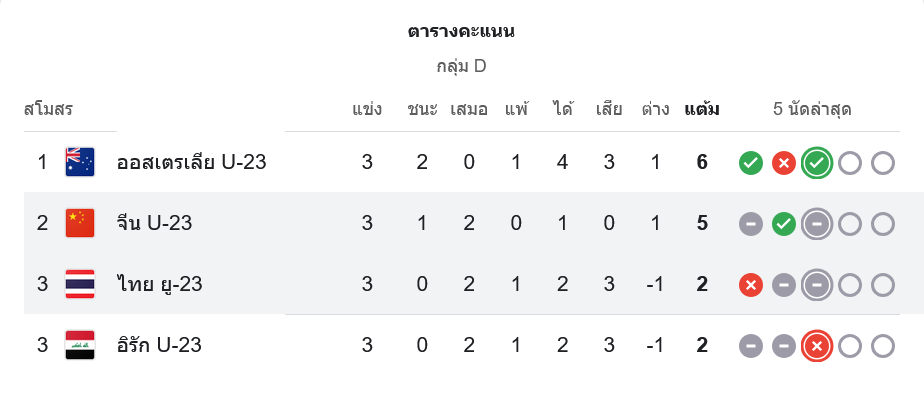 📊 สถานการณ์ในตารางคะแนน ยู-23 ชิงแชมป์เอเชีย กลุ่มดี