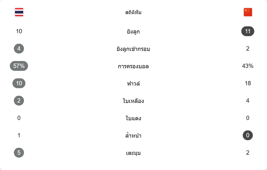 ตัวเลขหลังเกมสะท้อนรูปเกมได้ชัด ไทย ยู-23 ยิงรวม 10 ครั้ง มากกว่าจีนที่ยิง 11 ครั้งเล็กน้อย แต่ไทยมีโอกาสเข้ากรอบ 4 ครั้ง ขณะที่จีนยิงเข้ากรอบเพียง 2 ครั้ง การครองบอลไทยเหนือกว่า 57% ต่อ 43% แปลว่าช้างศึกเป็นฝ่ายคุมจังหวะเกม จ่ายบอลถ่ายไปมาหาช่อง ส่วนจีนเลือกยืนต่ำ รอจังหวะสวนกลับ
