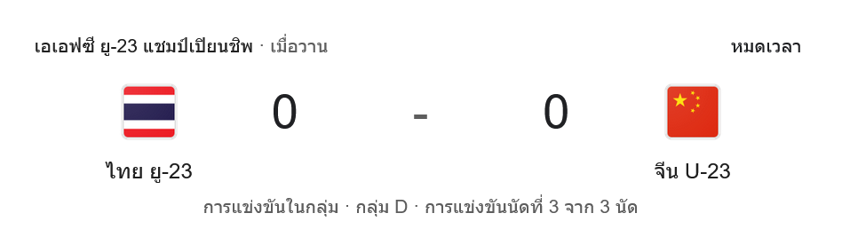 ศึกยู-23 ชิงแชมป์เอเชีย 2026 กลุ่มดี นัดชี้ชะตา ทีมชาติไทย ยู-23 เจอกับ จีน ยู-23 เกมนี้เดิมพันคือโอกาสลุ้นเข้ารอบ 8 ทีมสุดท้าย บ้านกีฬา เช็กจากสกอร์แบบเรียลไทม์เหมือนตามดู ผลบอลสด ในสนาม บอกเลยว่าตึงเครียดตั้งแต่นกหวีดแรกจนจบ 90 นาที ก่อนจบลงด้วยสกอร์ 0-0 ที่ส่งผลต่างกันสุดขั้ว ช้างศึกจบเส้นทางแค่รอบแบ่งกลุ่ม ส่วนมังกรหนุ่มผ่านเข้ารอบไปชนอุซเบกิสถาน
