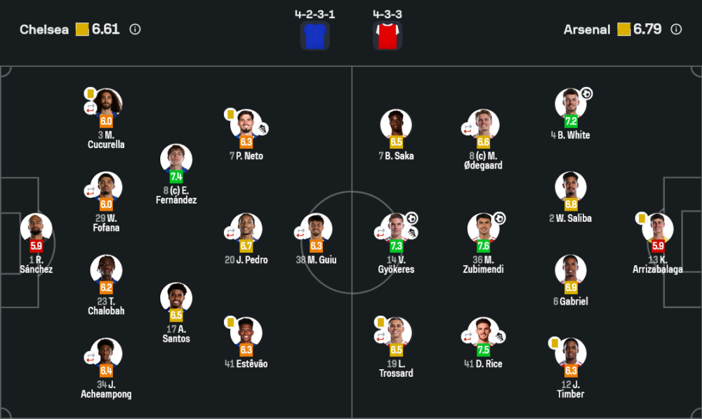 • โรเบิร์ต ซานเชซ 5.9 – เสียสามประตูแต่ก็มีช็อตเซฟสำคัญหลายครั้ง โดยเฉพาะลูกยิงของ ฮาแวร์ตซ์ และจังหวะกดของยอเคเรสช่วงท้าย