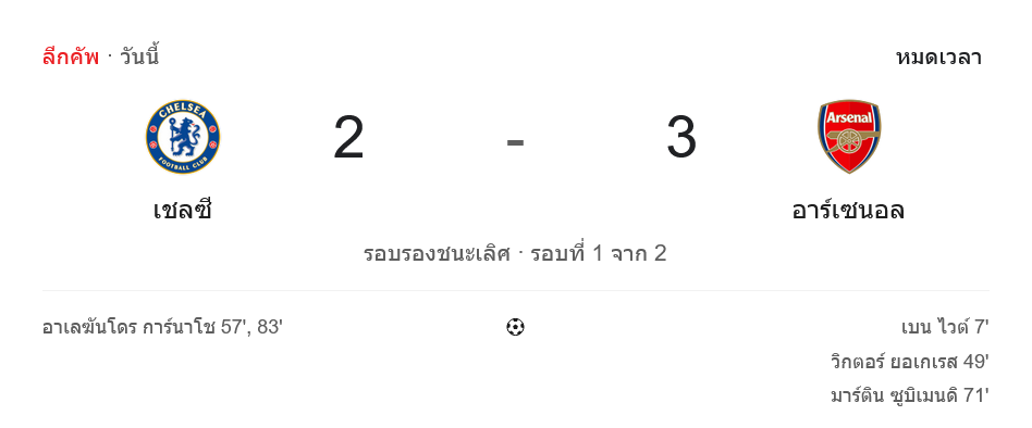ช่วงทดเจ็บ เชลซีโหมบุกสุดลิ่ม เปโดร เนโต้ ได้ทั้งยิงและโหม่งลุ้นประตูตีเสมอ แต่ เกปา ยังเซฟไว้ได้หมด ขณะที่ เยอร์เรียน ทิมเบอร์ มาโดนใบเหลืองท้ายเกมจากจังหวะตัดฟาวล์แบบไม่สนสกอร์ สุดท้ายหมดเวลา เชลซีแพ้คาบ้าน 2-3 ต้องไปวัดกันต่อในเลกสองที่เอมิเรตส์ สเตเดี้ยม
