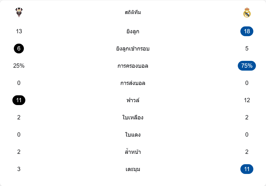 แม้อัลบาเซเต้จะเป็นฝ่ายชนะ แต่ตัวเลขหลายอย่างชี้ว่าเรอัล มาดริดคุมเกมเกือบทั้งหมด ทีมเยือนยิงรวม 18 ครั้ง เข้ากรอบ 5 ครั้ง ขณะที่เจ้าบ้านยิง 13 ครั้งแต่เข้ากรอบถึง 6 ครั้ง แสดงให้เห็นว่าทุกจังหวะที่ขึ้นไปลุ้นมีน้ำหนักอย่างยิ่ง การครองบอลมาดริดนำลิ่ว 75% ต่อ 25% ทว่ากลับเปลี่ยนเป็นสกอร์ไม่ได้มากเท่าที่ควร แม้ทั้งสองทีมจะไม่มีตัวเลขผ่านบอลยาวหรือต่อบอลกันมากมาย แต่สถิติฟาวล์ใกล้เคียง 11 ต่อ 12 ใบเหลืองฝั่งละ 2 ใบ ล้ำหน้าฝั่งละ 2 ครั้ง ขณะที่ลูกเตะมุมราชันเหนือกว่าชัดเจน 11 ต่อ 3 ทว่ากลับเป็นอัลบาเซเต้ที่ใช้เซตพีซได้คมกว่าและเปลี่ยนเป็นประตูสำคัญถึงสองลูก