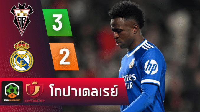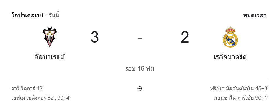 ฟุตบอล โกปา เดล เรย์ รอบ 16 ทีม ที่สนามของอัลบาเซเต้ กลายเป็นค่ำคืนสุดช็อกสำหรับแฟนราชันชุดขาว เมื่อทีมรองจากเซกุนด้าเปิดบ้านไล่บดจนแชมป์ยุโรปต้องร่วงตกรอบแบบสุดดราม่า 3-2 แฟนบอลที่กดเช็ก ผลบอลสด กันทั้งเกมได้เห็นทุกอารมณ์ ทั้งการคัมแบ็ก การโดนตีเสมอ และการโดนยิงฝังช่วงทดเจ็บจากฮีโร่ชื่อ เยฟเต้ เบตันกอร์