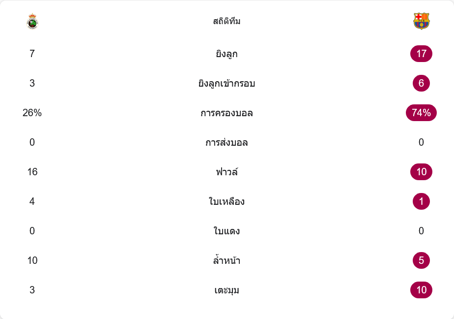 ตัวเลขหลังเกมสะท้อนรูปเกมอย่างแท้จริง บาร์เซโลนากระหน่ำยิงรวม 17 ครั้ง เข้ากรอบ 6 ครั้ง ขณะที่เจ้าถิ่นมีโอกาสแค่ 7 ครั้ง เข้ากรอบ 3 ครั้งเท่านั้น การครองบอลก็ชัดเจน ทีมเยือนเก็บไปถึง 74% ส่วนราซิ่งมีเพียง 26% ต้องวิ่งไล่ไล่บีบอยู่ตลอด