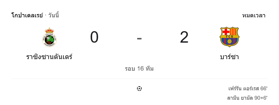 ค่ำคืนบอลถ้วยสเปนในรายการ โกปา เดล เรย์ รอบ 16 ทีมสุดท้ายที่เอล ซาร์ดินาโร ราชันเขียว–ขาว ราซิ่ง ซานตานเดร์ เปิดรังรับมหาอำนาจจากกาตาลุนญาอย่าง บาร์เซโลนา เกมนี้รูปเกมออกมาชัดเจนว่าเป็นการวัดใจระหว่างทีมที่ครองบอลดุ กับเจ้าถิ่นที่เล่นดักจังหวะสวนกลับและวิ่งสู้ฟัดตลอด 90 นาที สุดท้ายสกอร์ในหน้า ผลบอลสด ยืนยันชัด บาร์ซ่าเก็บชัย 0-2 จากประตูของ เฟร์ราน ตอร์เรส และ ลามีน ยามาล เข้ารอบแบบไม่ต้องลุ้นดวลจุดโทษให้เสียว