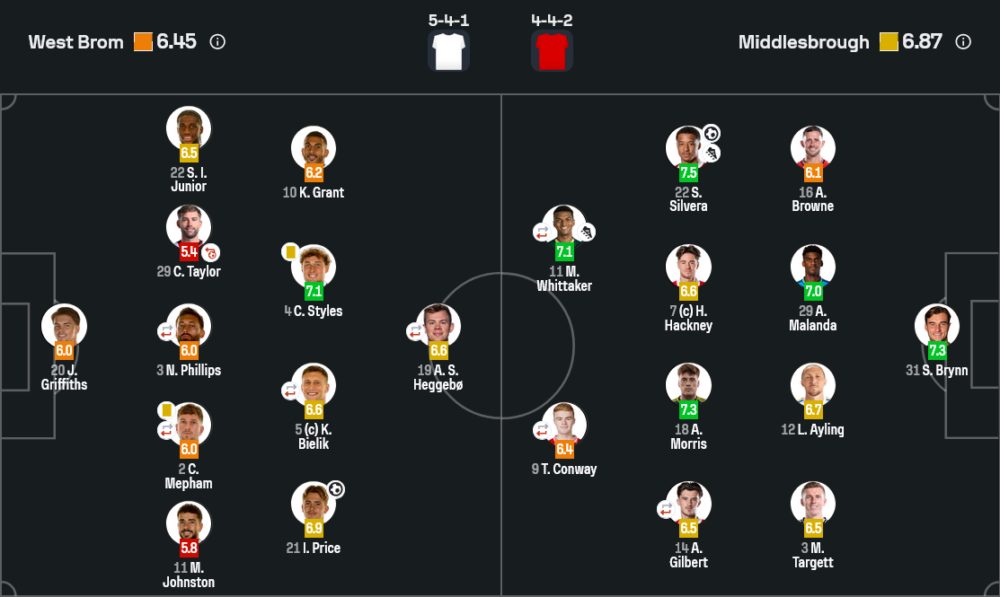 ท้ายเกม เวสต์บรอมวิชดันเสียจังหวะจากการตัดฟาวล์ของ คัลลัม สไตลส์ นาทีที่ 88 จนโดนใบเหลือง จากนั้น มิดเดิลสโบรห์ บุกสวนกลับ นาทีที่ 90 ช่วงทดเวลา แซม ซิลเวร่า แทงทะลุช่องให้ เดลาโน เบิร์กซอร์ก หลุดทางขวาแต่งหนึ่งจังหวะแล้วซัดเสียบมุมล่างอย่างเยือกเย็น กลายเป็นประตูชัย 3-2 ที่เงียบทั้งสนามและทำให้เจ้าถิ่นแทบทรุดคาเดอะ ฮอว์ธอร์นส์