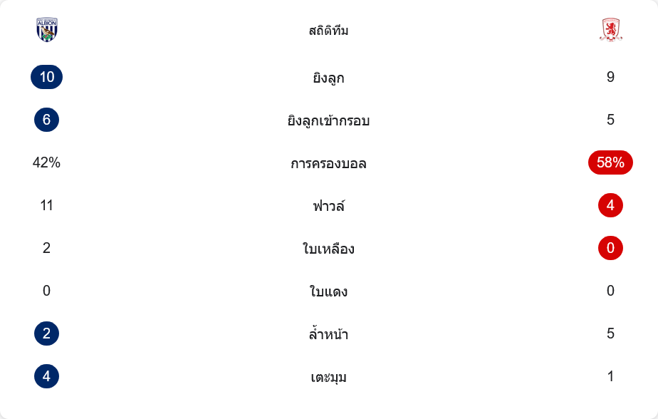 ด้านการครองบอล มิดเดิลสโบรห์ถือบอลเหนือกว่าที่ 58% เทียบกับ เวสต์บรอมวิช 42% แปลว่าทีมเยือนคุมจังหวะเกมได้ดีกว่า ทั้งที่เล่นเป็นทีมเยือน ฟาวล์ของเจ้าบ้านสูงถึง 11 ครั้ง เทียบกับโบโร่แค่ 4 ครั้ง แสดงให้เห็นถึงการไล่บี้แบบหนักหน่วงจนต้องตัดเกมบ่อย อีกมุมที่น่าสนใจคือ เวสต์บรอมวิชได้เตะมุม 4 ครั้ง ขณะที่ มิดเดิลสโบรห์ ได้แค่ 1 ครั้ง แต่อาศัยการเข้าทำในโอเพ่นเพลย์ที่เฉียบกว่าแทน