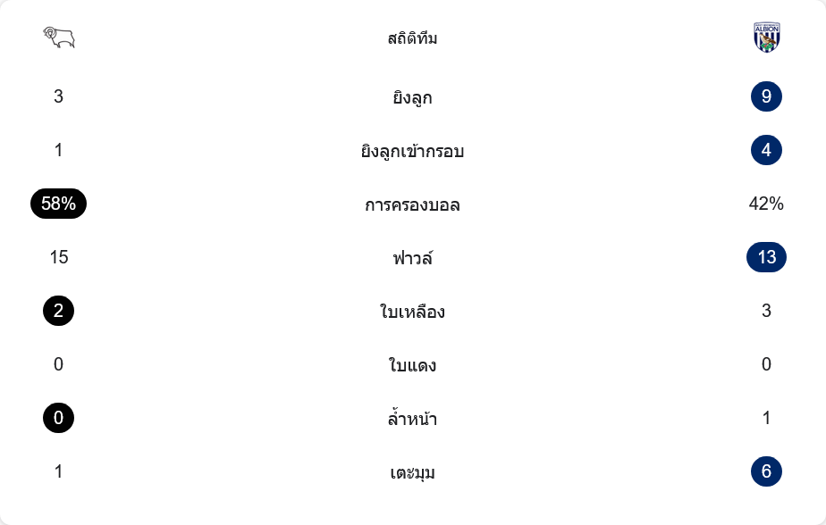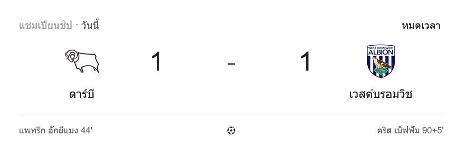 - ⏱️ จบเกม ดาร์บี้ เคาน์ตี้ 1-1 เวสต์บรอมวิช อัลเบี้ยน แบ่งแต้มกันไปแบบระทึกใจ