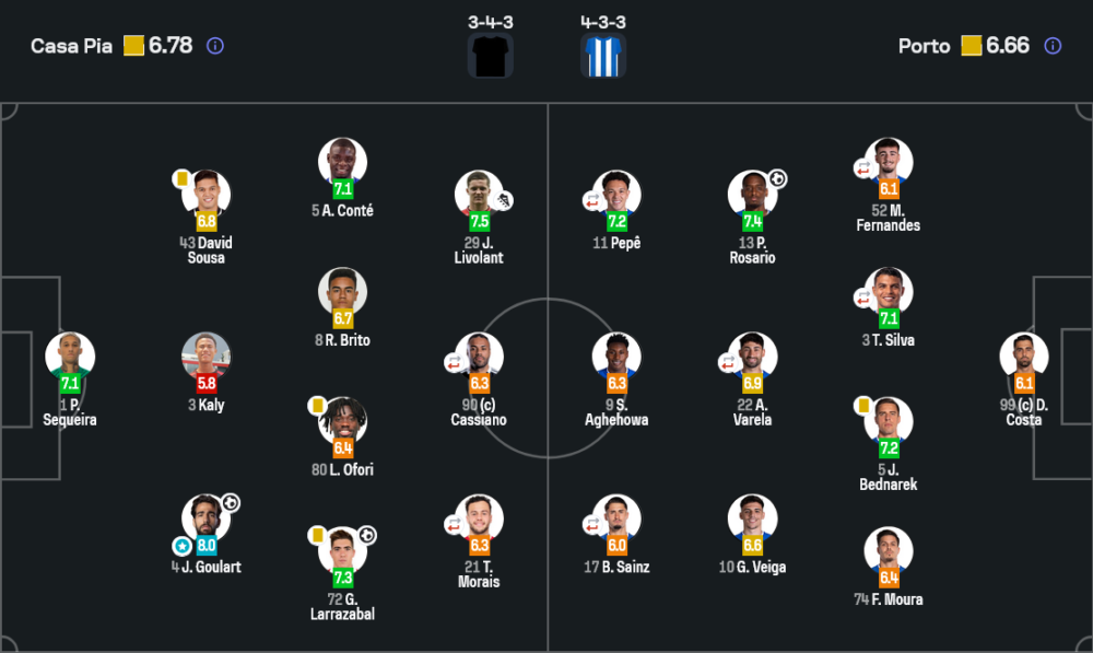 ฮีโร่ของเกมนี้ต้องยกให้ ชูเอา กูลาร์ต เซ็นเตอร์แบ็กคาซ่า เปียที่ได้เรตติ้งสูงสุด 8.0 ไม่ใช่แค่มีส่วนสำคัญกับประตูที่สองจากลูกเซ็ตเพลย์ แต่ตลอดทั้งเกมเขาอ่านจังหวะบอลยาวของปอร์โต้ได้เยี่ยม สกัดกลางอากาศแทบไม่พลาด ช่วยเคลียร์บอลอันตรายหลายครั้ง เวลาเพื่อนหลุดตำแหน่งก็ตามซ้อนทันเสมอ แถมยังคุมแนวรับให้ยืนกันเป็นแผง ไม่มีช่องให้โรซาริโอหรือซามู อาเกโฮวาหลุดเข้าไปยิงง่าย ๆ ฟอร์มแบบนี้ทำให้แฟนเจ้าถิ่นเทใจให้เป็น “กำแพงเหล็กของค่ำคืน” อย่างไม่ต้องสงสัย