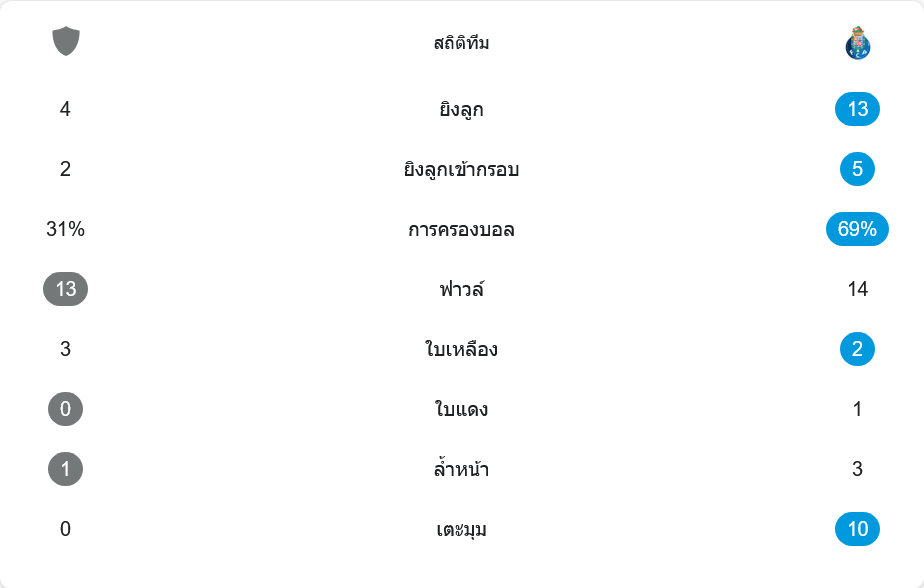 แม้สกอร์จะออกมาที่คาซ่า เปียชนะ 2-1 แต่ตัวเลขในสนามบอกชัดว่าปอร์โต้คือฝ่ายครองเกมบุกแทบทั้งแมตช์ ทีมเยือนยิงรวม 13 ครั้ง เข้ากรอบ 5 ครั้ง ขณะที่เจ้าบ้านมีโอกาสเพียง 4 ครั้ง เข้ากรอบ 2 ครั้งแต่เปลี่ยนเป็นสองประตูเต็ม ๆ แสดงให้เห็นถึงความเฉียบขาดในจังหวะสุดท้าย