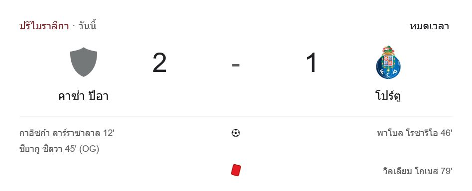 แล้วจุดเปลี่ยนสำคัญก็มาถึงนาที 79 เมื่อ วิลเลียม โกเมส ตัวสำรองของปอร์โต้เข้าเสียบหนักจนโดนใบแดงไล่ออกจากสนาม ทิ้งเพื่อนร่วมทีมเหลือ 10 คนในช่วงท้ายเกม แม้จะทดเวลาเจ็บถึง 11 นาที แต่คาซ่า เปียก็ใช้เกมรับที่แน่นและการถ่วงเวลาที่มีชั้นเชิง ปิดเกมเชือดจ่าฝูง 2-1 ได้สำเร็จ เสียงเฮดังลั่นจากแฟนเจ้าบ้าน ส่วนแฟนทีมเยือนต้องกลับไปดูไฮไลท์ในหน้า ผลบอลสด แบบเจ็บ ๆ กันไป