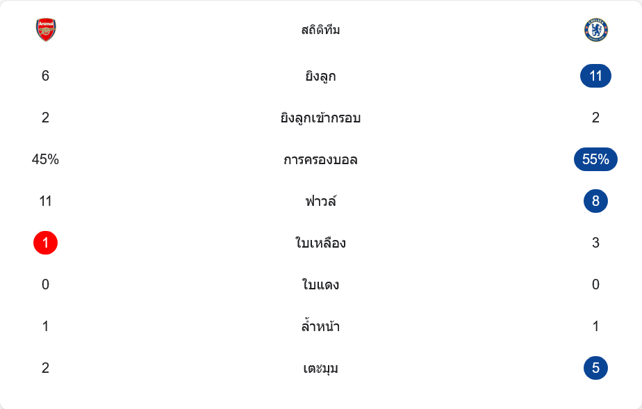 ตลอด 90 นาทีเชลซีเป็นฝ่ายเดินเกมมากกว่า ครองบอล 55% ต่อ 45% และมีจังหวะยิงรวม 11 ครั้ง ขณะที่อาร์เซนอลยิง 6 ครั้ง แต่ที่น่าสนใจคือจำนวนยิงเข้ากรอบเท่ากันที่ 2-2 สะท้อนว่าอาร์เซนอลเลือกจังหวะยิงแบบ “เน้นคุณภาพ” มากกว่าเกมปริมาณ เกมค่อนข้างเดือดจากการปะทะและจังหวะตัดเกม ทำให้ฟาวล์อาร์เซนอล 11 ครั้ง เชลซี 8 ครั้ง ใบเหลืองเชลซีเยอะกว่าที่ 3 ต่อ 1 ส่วนเตะมุมเชลซีได้ถึง 5 ครั้ง ขณะที่อาร์เซนอลได้ 2 ครั้ง—แต่สุดท้ายลูกที่เปลี่ยนเกมกลับเป็นสวนกลับในช่วงทดเจ็บแบบเจ็บลึก